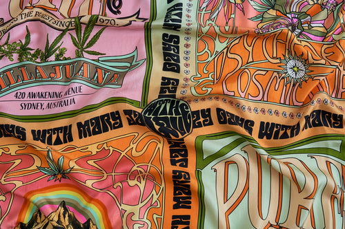 The Lets Chase Rainbows Button Through Batwing Kaftan depicts psychedelic postcards of cannabis and vintage poster art. Immerse yourself in pure luxury with this CAMILLA silk kaftan showcasing raglan sleeves that elegantly cascade into wide,
