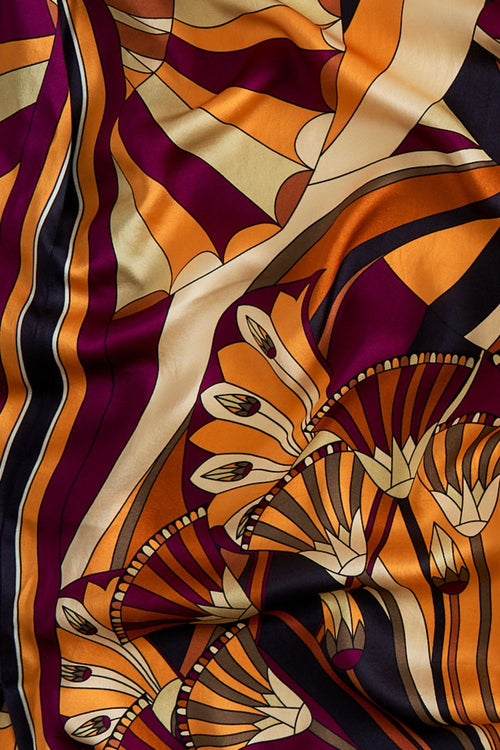 The Desert Delirium Button Through Batwing Kaftan depicts a retro inspired geometric desert scape in rich tones of soft nude, burgundy and oranges. This luxury resort wear kaftan defeaters a timeless round neckline with a button front placket that flows from a relaxed fit body with gentle drape created by the wide short batwing sleeves. The long line falls into a slight high low hemline and can be worn open as decadent layer or cinched in at the waist. Explore more from the House Of The Sun collection.