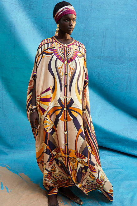 The Desert Delirium Button Through Batwing Kaftan depicts a retro inspired geometric desert scape in rich tones of soft nude, burgundy and oranges. This luxury resort wear kaftan defeaters a timeless round neckline with a