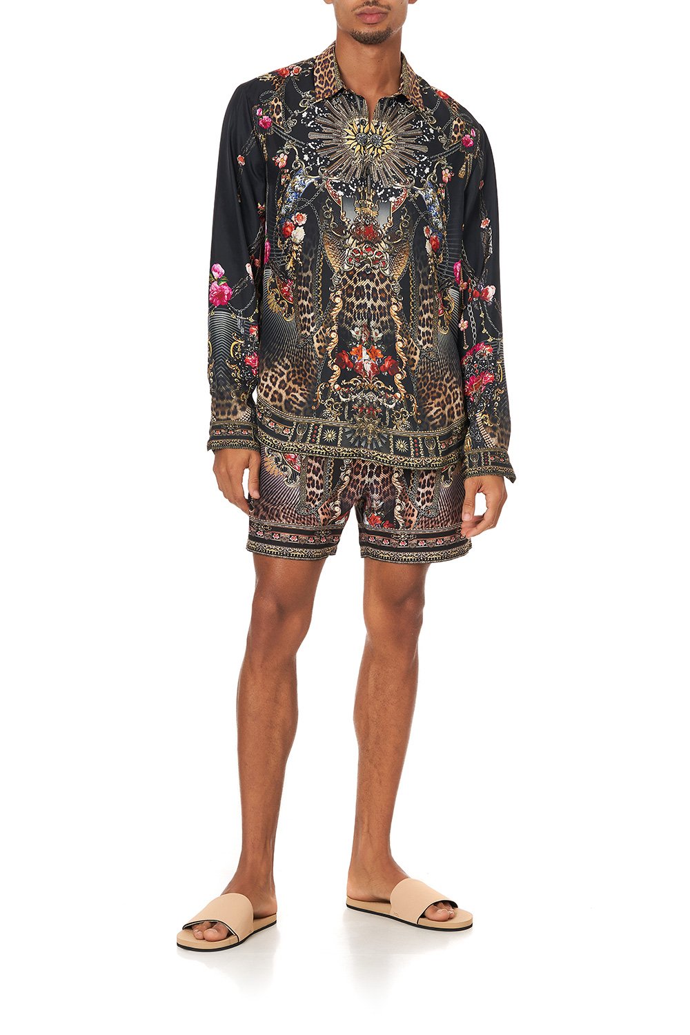 A majestically modern take on the architecture of the Middle Ages, the Gothic Goddess Collared Long Sleeve Shirt is a bold button up, fashioned from pure CAMILLA silk and printed with kaleidoscopic leopard and floral motifs. This statement long sleeve boasts cuffs and plackets hemming the sleeves as well as a contrasting leopard collar. Pair with the matching Gothic Goddess Elastic Waist Boardshort for a casual look or dress up with suit pants for more formal occasions.