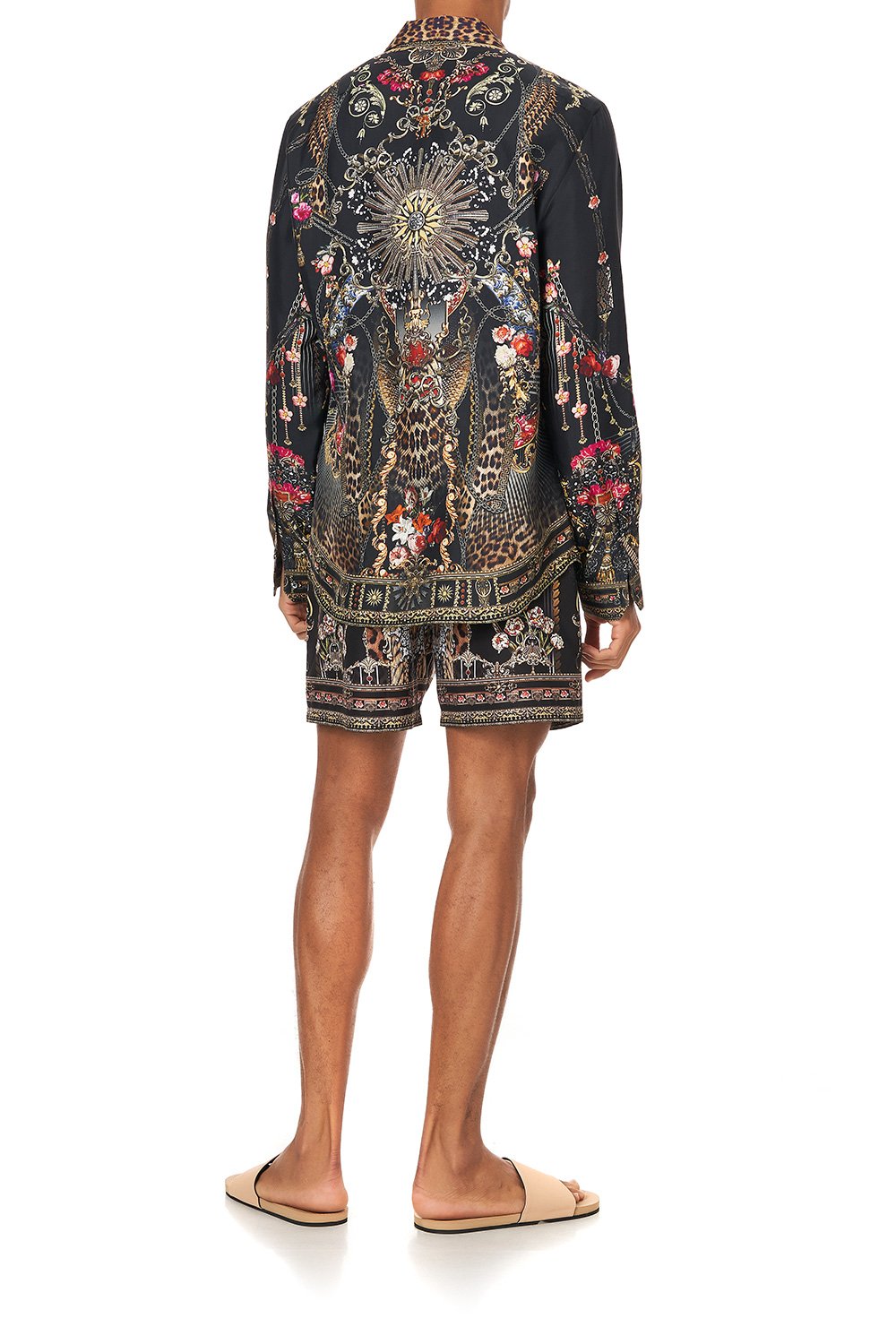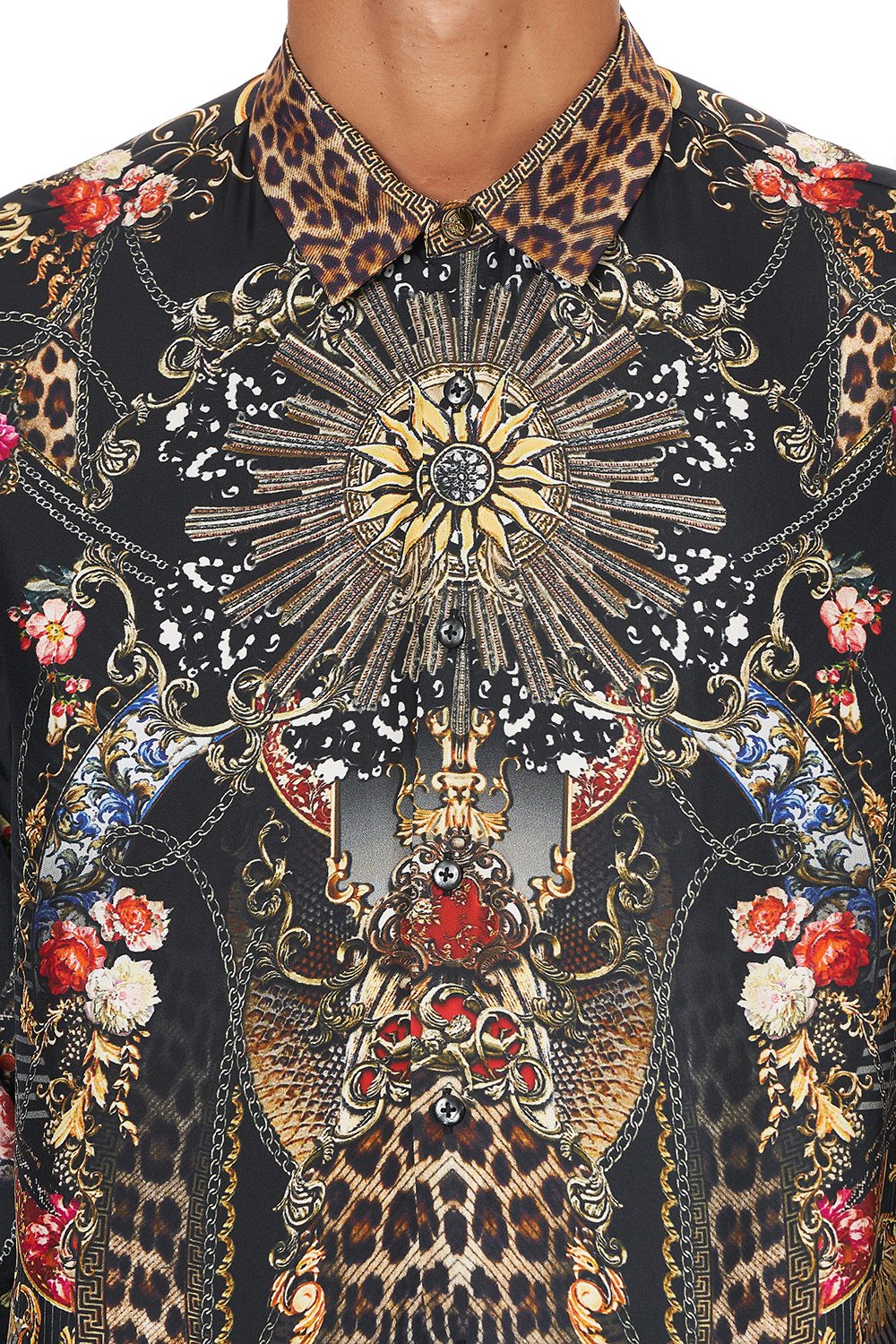 A majestically modern take on the architecture of the Middle Ages, the Gothic Goddess Collared Long Sleeve Shirt is a bold button up, fashioned from pure CAMILLA silk and printed with kaleidoscopic leopard and floral