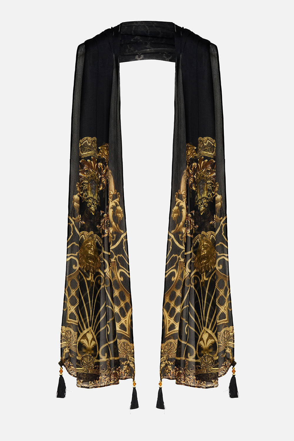 A final pièce de résistance to the décolletage, the Shadows Of Armada Long Scarf adorns classic midnight shades that are encased with gold baroque detailing and striking big cat portraits. Complete with hand-embellished CAMILLA crystals,