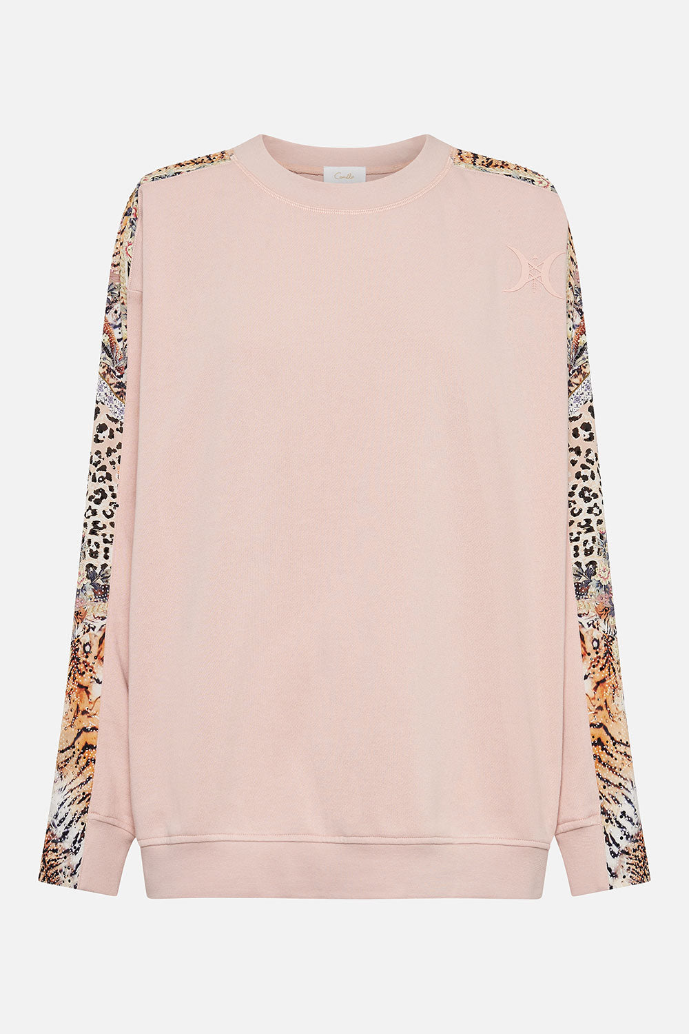 Luxe loungewear adoring wild majesty, the Moto Maiko Oversized Sweat With Contrast Stripe is a vision in dusty pink as blush botanicals, soft cocoa animal print and ferns of olive hues elevate along the sleeve.