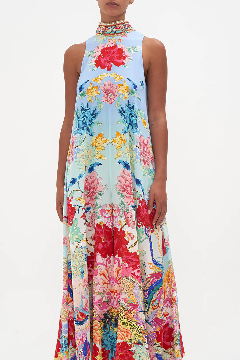 The Go Stag High Neck Flared Jumpsuit captivates with soft blue hues detailed with botanicals blooming in shades of crimson, dandelion and blush. Adorning hand-embellished CAMILLA crystals, this luxury silk jumpsuit plays host to a