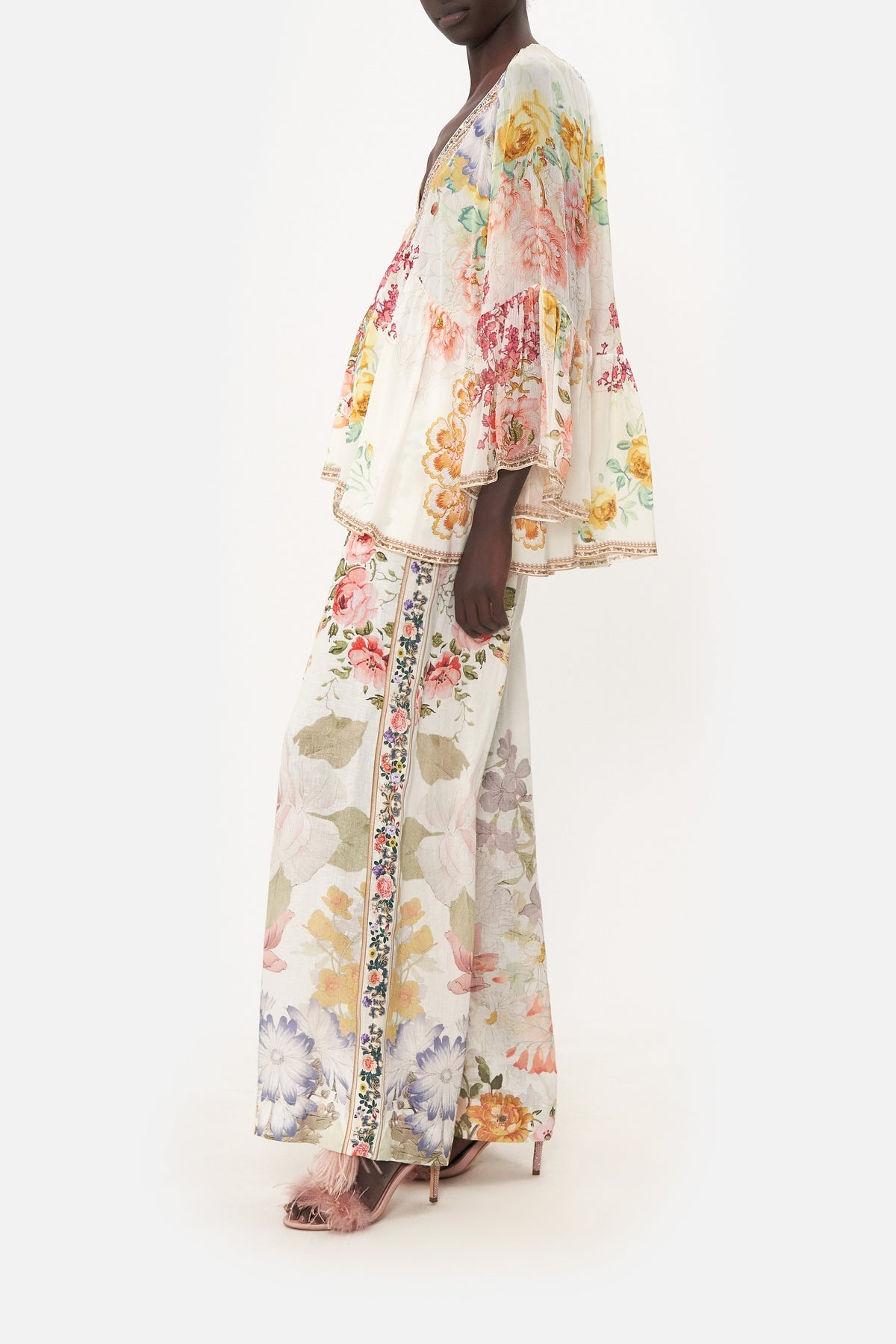 BeEUtifully billowed with blooming bohemia, the Romantic Rites Raglan Blouse With Sleeve Ruffle tantalises with cascades of blush botanicals, florals dipped in lilac hues and vines of slated green amidst a sea of dainty ivory. Crafted from luxury silk, this statement blouse features a drapey raglan sleeve that falls into a ruffled accent, hand-embellished CAMILLA crystals, a classic v neckline and a relaxed silhouette that meets a flared hemline.