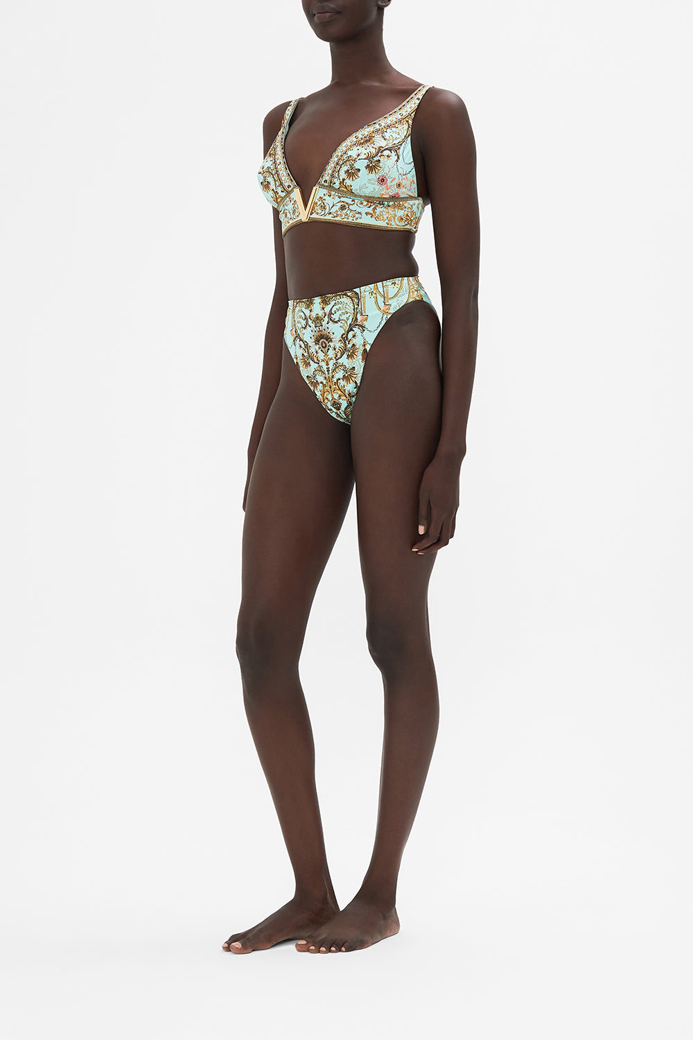 The Adieu Yesterday High Waist Cheeky Pant explores a mesmorising sea of celestial blue hues finished with ornate golden swirls that dance alongside decadent botanical details and exquisite chain cascades. Crafted from ECONYL® regenerated nylon, this sustainable bikini bottom is home to a high-waisted silhouette , a high-rise cut to elongate the leg and signature CAMILLA adornments.