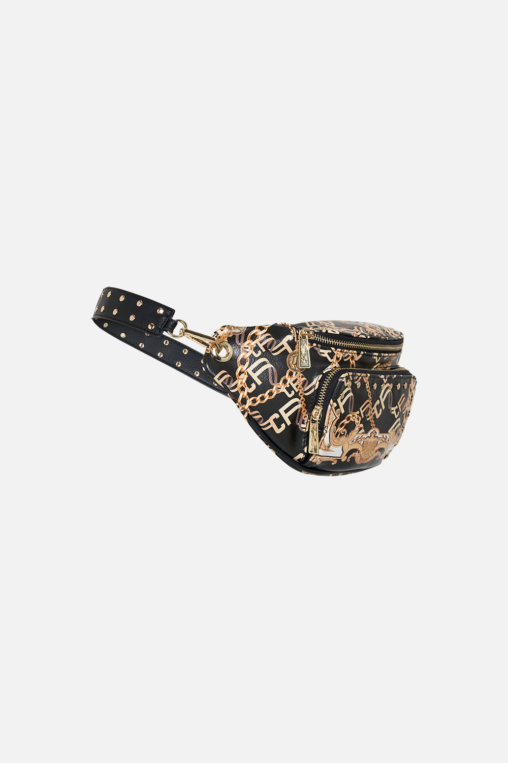 The Tether Me Not PU Belt Bag is an immersion into a elaborately opulent world of sleek palatial curves, offset with sharp monogram mosaic patterns. Gilded baroque adornments and chains glimmer against graphically bold onyx and ivory contrasts. Adorning all-over gold stud detailing, this belt bag is home to metallic hardware accents, zip fastening, a customisable fit and an extra front pocket for your essentials.Explore more from The Moral Of The Story: Act II collection.
