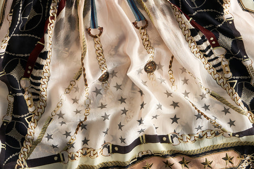 - soft pink print with gold chain accents