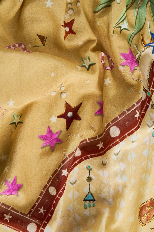 Designed in Australia, The Aswan Abstract Strappy High Low Dress With Pockets is a love story of traditional handicrafts and hand painted camels, crescent moons, and palm fronds, embedded in exquisite architectural borders. Lovingly handcrafted, this luxury high-low dress features a chic V front and back neckline with thin adjustable straps. With a shaped bust area that falls into a flowy skirt, this CAMILLA party dress creates statement billow with every step.