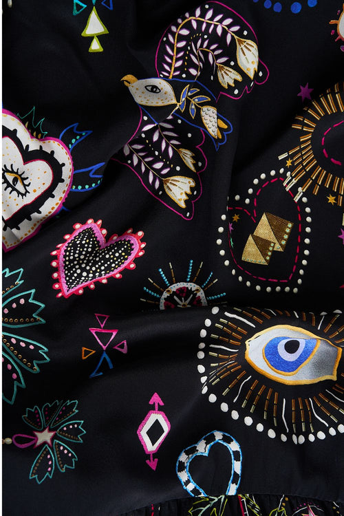 Designed in Australia, The Nubian Nights A-Line Gathered Panel Dress awakens the artistry amidst the Nubian Village at nightfall, accenting a starry night adorned with vibrant embroidery motifs and symbolic depictions. Lovingly handcrafted, this CAMILLA silk mini dress features an elegant V neckline with delicate tie details. The voluminous swing-shaped body is finished with gathered panel seams followed by a deep ruffle detail upon the hem and flared sleeves.