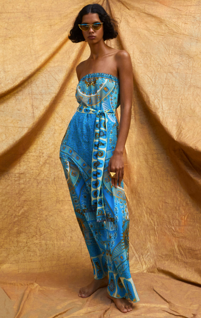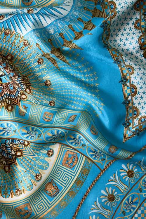 Designed in Australia, The Temple Of Light Gather Neck Hardware Maxi Dress unearths the opulence of Dendera and Hatshepsut’s divine legacy. Adorned with celestial motifs and majestic gold arches against a radiant aqua backdrop. Lovingly handcrafted, this luxury CAMILLA silk maxi dress features a bespoke hardware ring detail that creates a gathered neckline that falls into a relaxed A-line maxi silhouette. Adjustable straps and a back neckline allow for an opulently personalized fit.