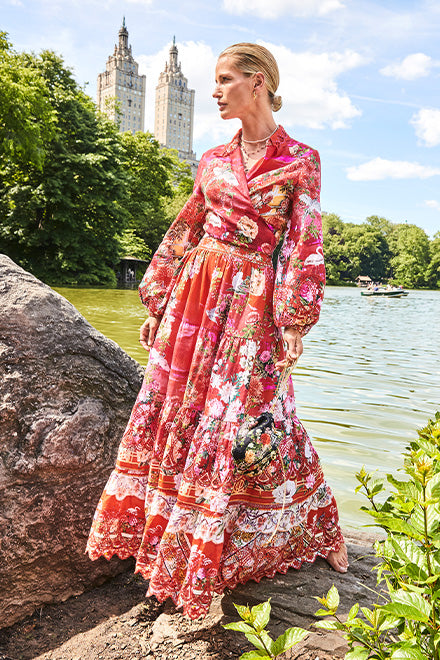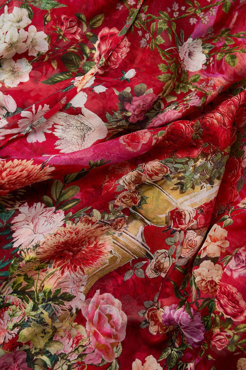 Designed in Australia, The Sweet Home Alexandria Frill Sleeve Top 4-10 vibrantly emulates the spirit of everlasting elegance and coastal serenity with tumbling florals and golden filigree intwined in sumptuous scarlet red. Lovingly handcrafted from