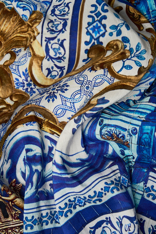 Designed in Australia, The Azul Adventures Button Front Frill Dress echoes the rich blue and yellow hues of Queluz Palace's artwork, featuring hand-painted motifs and scenes of Portuguese life, a tribute to Leho tilework and ceramic storytelling. Lovingly handcrafted, this CAMILLA dress is ornamented with a fit-and-flare silhouette, flowing into a double ruffle mini length hemline. The sumptuous mini dress features a V neckline and sophisticated blouson sleeves that radiate elegant femininity.