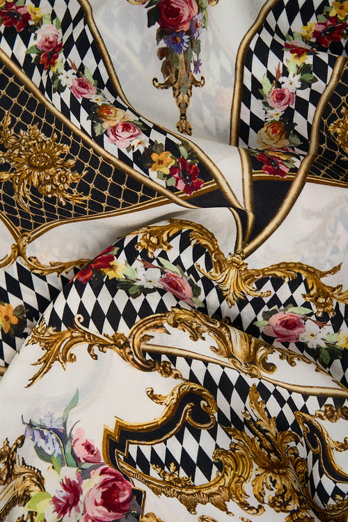 Designed in Australia, The Rococo Glow Off Shoulder Short Dress features framed florals, ornate borders, and intricate ceiling and floor details that capture the regal elegance of the Palace of Queluz. Lovingly handcrafted, this luxury silk off-the-shoulder dress features a shirred elastic neckline that falls into a blousy bodice, elegantly cinching into an adjustable waistband. The soft gathered skirt flares into a wide ruffle hemline that dances playfully at mid-thigh level.