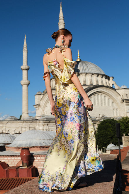 The Darling Buds Ruffle High Low Dress With Long Sleeve is a handcrafted silk silhouette designed by our in house artisans. Reimagined in an exclusive limited edition print, our high-low dress features a beautiful bow