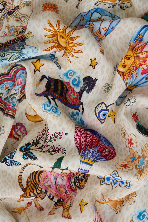 The Kapadokya Kitsch V-Neck Embroidered Midi Dress is a handcrafted silhouette designed by our in house artisans. Reimagined in an exclusive limited edition print, this dress is relaxed fitting and falls to a mid length hemline adorned with ruffle details. It features a v neckline and waist tie with CAMILLA tassel charms and is meticulously crafted with hand beading and intricate crystal embellishments.