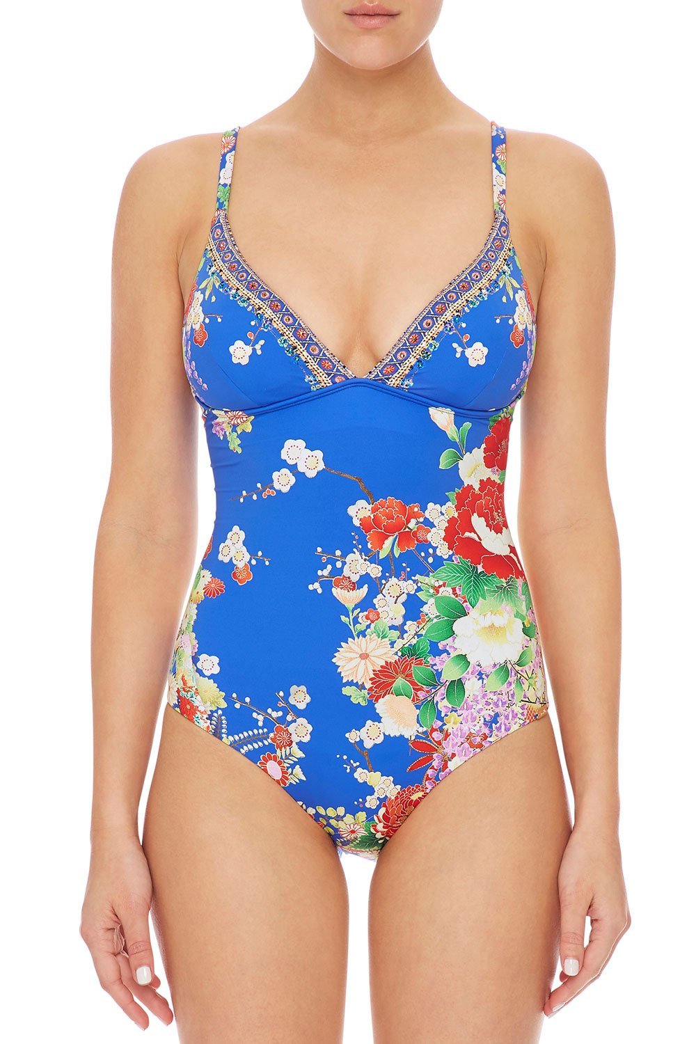 Like a nocturnal rainbow illuminating the sky, the Playing Koi DD Cup High Tri One Piece reveals the vibrant floral wonders of mystical Japan with a mesmerising hand-painted print. This sensuous one-piece swimsuit features a plunging v-neck, removable soft cups and a delicate crystal- embellished trim for a look of divine radiance.