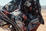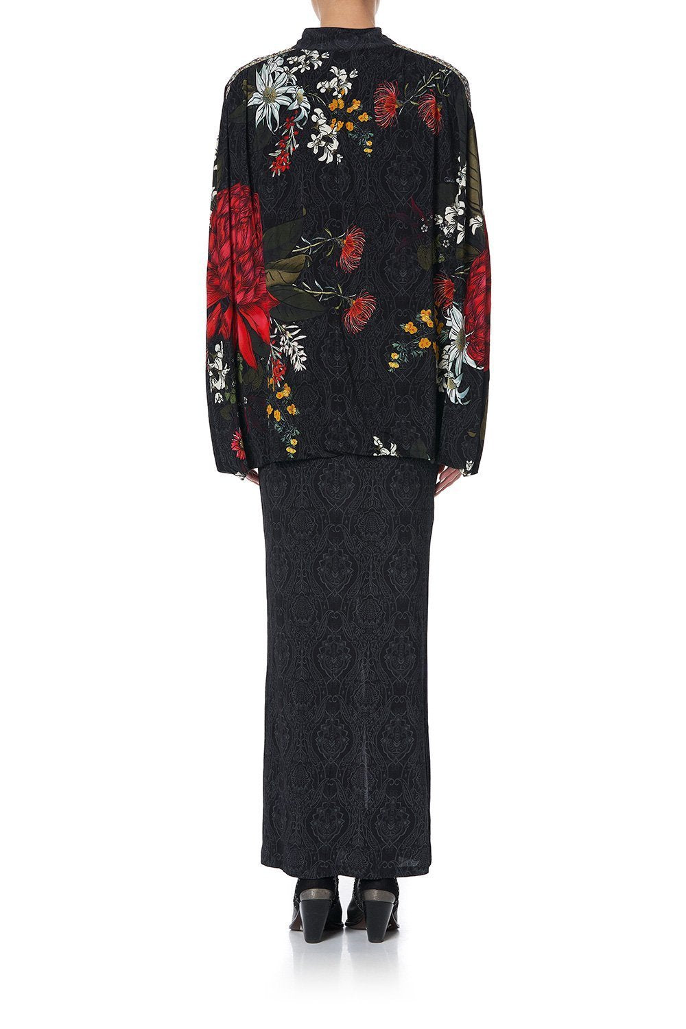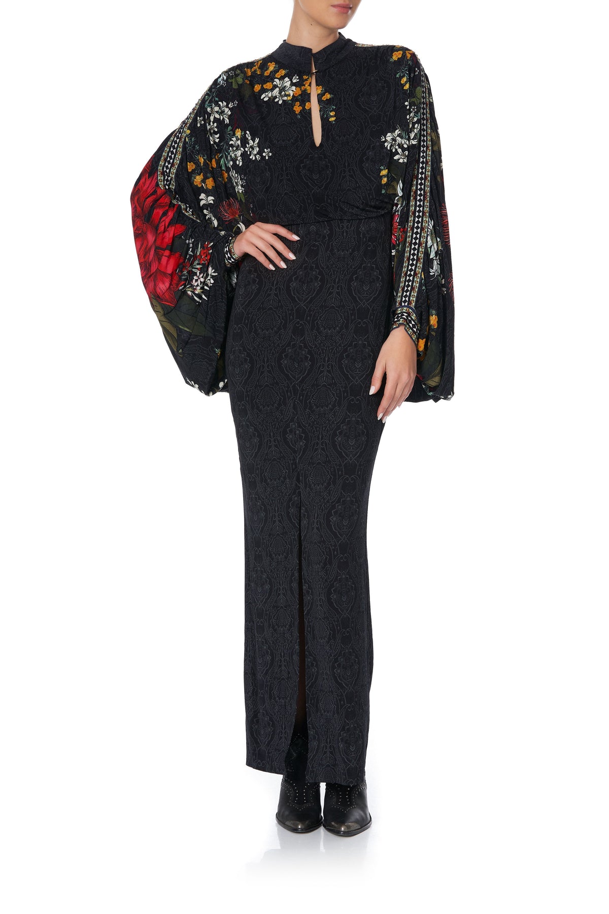 With the red floral flourishes and moody hues of the Blue Mountains as muse, the Ms Matilda Jersey Dress with Cape is effortlessly regal. This patterned maxi dress features a high neckline, flattering keyhole opening at the centre fold, cape back, as well as delicate neckline crystals as detail.