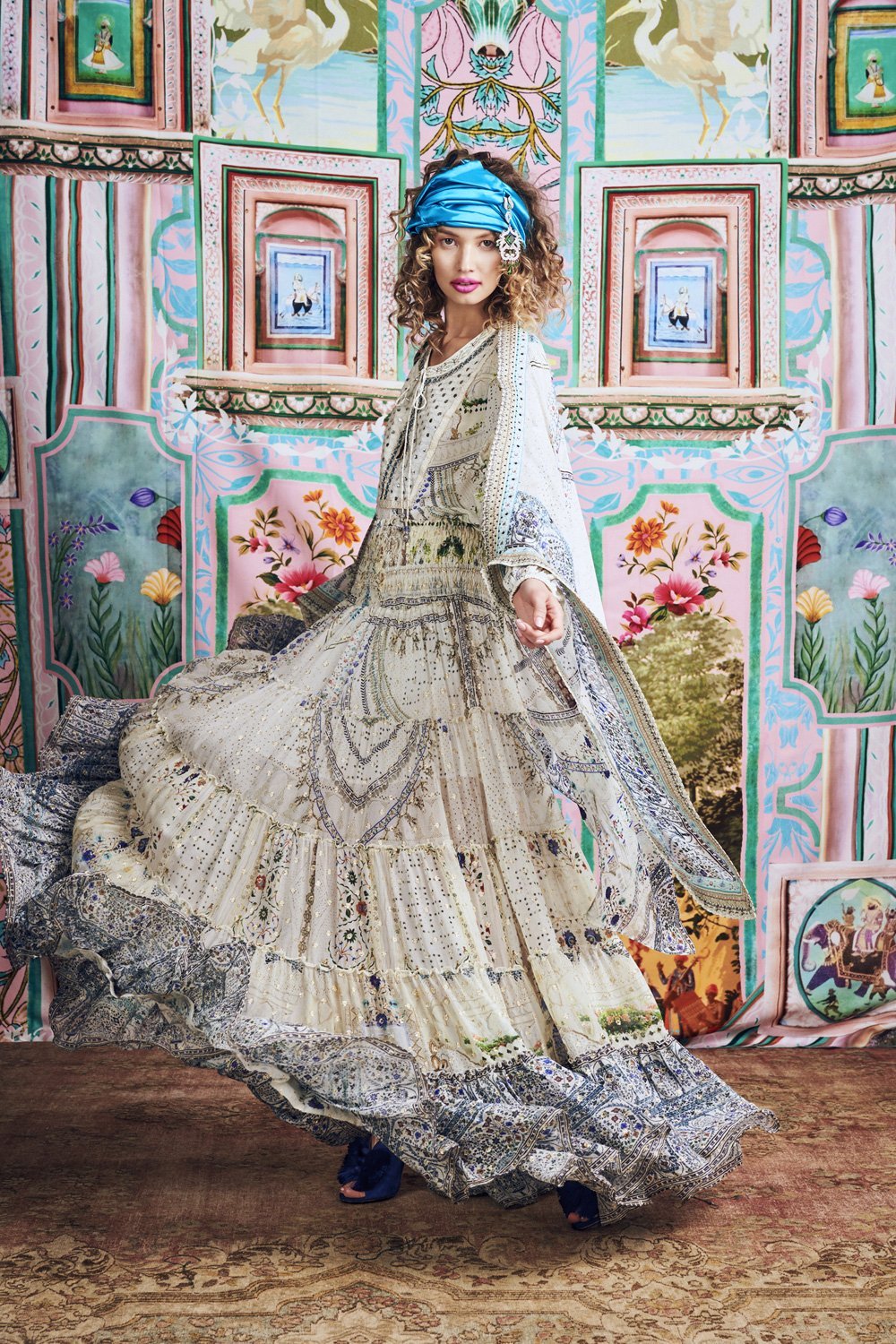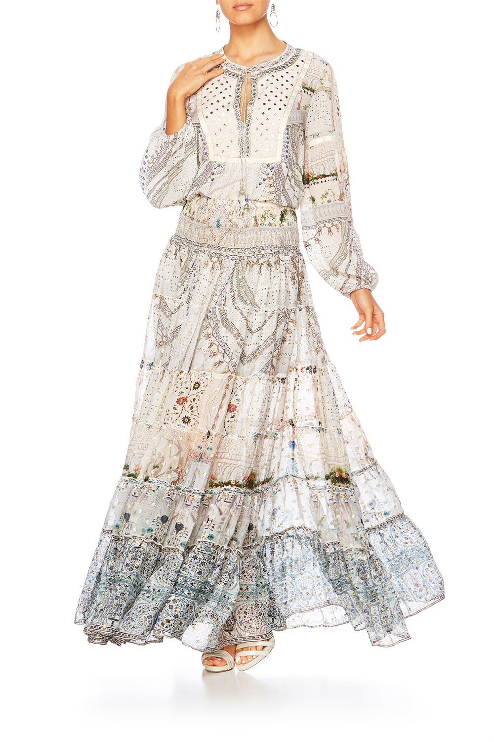 Inspired by Sylvia, Camilla's beloved grandmother and mystical muse, the Breakfast With Sylvia Longline Peasant Top reveals the meandering vines and ornamental lattice of ancient India in a heavenly hand-painted print. This ethereal placement-print blouse features an opulent embroidered yoke, beaded tassels and luminous metallic foil details for a luxurious bohemian look.