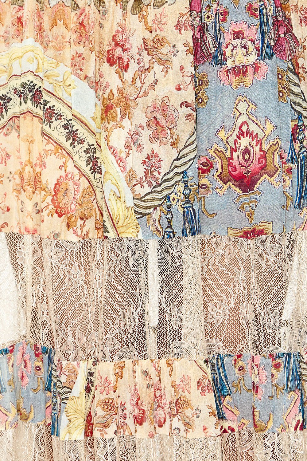Inspired by the dusk till dawn soirees of 16th century French royalty, the Jeanne Queen Maxi Skirt with Lace Inserts is proudly extravagant. Featuring rose-coloured highlights, lace contrast panels, shirred waistband, and half lining –