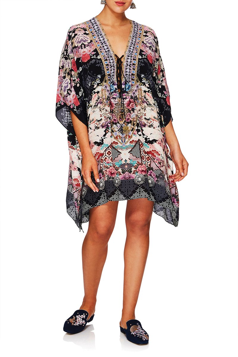 Celebrating the girl you were and the woman you have become, the Nights With Her Short Lace Up Kaftan reveals Japan’s mystical crane, the bird of happiness, fluttering across a hand-painted print of pure silk.