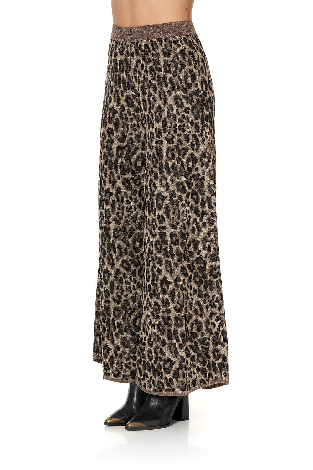 Captivated by a shimmering leopard fairytale creature, the Lotus Lovers Super Wide Flare Pant were inspired by a feminine exploration of tales. Made from luminous metallic yarn, these enchanting knitted trousers feature a contrast waistband,