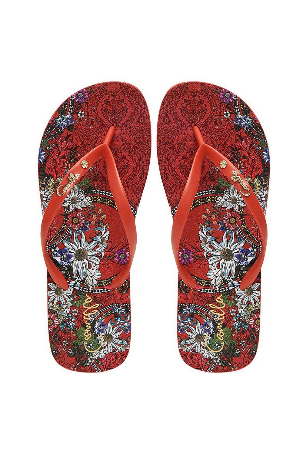 Beguiled by the bush blooms hiding in the heart of the Blue Mountains, the Wondering Waratah Thong embraces bold red hues. This bejeweled flip flop features charming printed rubber, a custom Camilla logo, floral flourishes,
