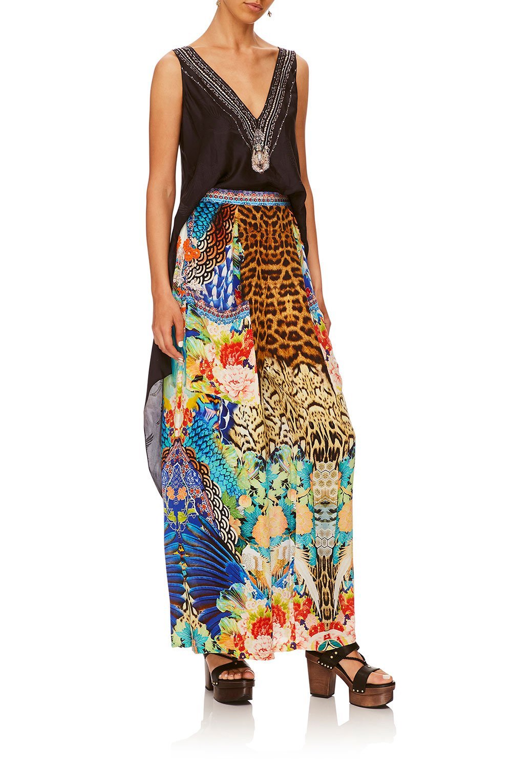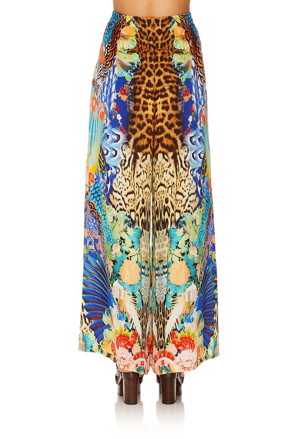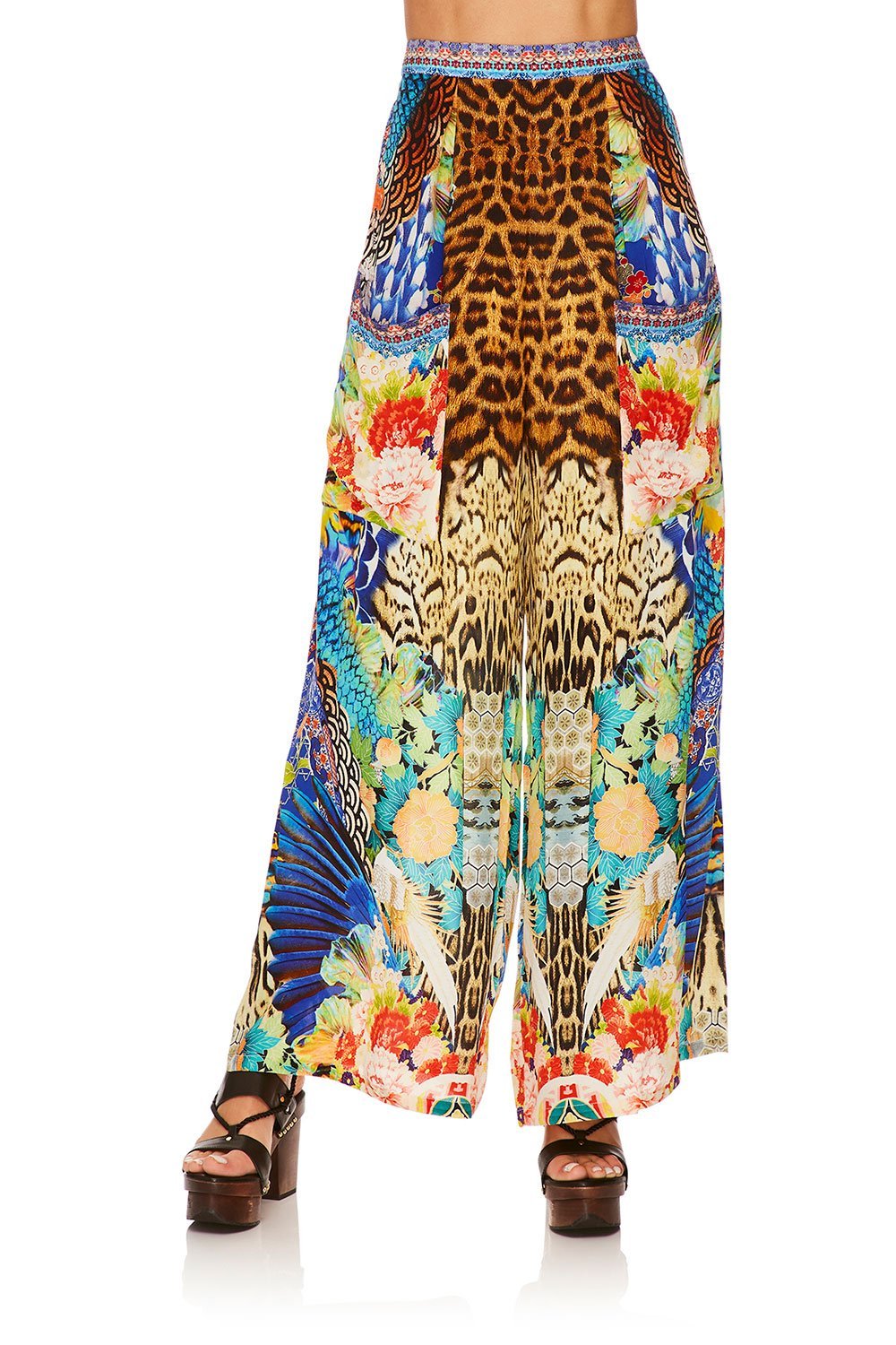 A soulful celebration of her time to shine, the Space Cowgirl Wide Leg Trouser with Front Pockets details Japan's ancient mythology and rich ornamental motifs with a captivating animal-inspired print. BeEUtifully comfortable with a relaxed wide-leg shape, these dreamy silk trousers feature roomy patch pockets, delicate hand placed crystals and a free-flowing silhouette that moves with a gentle grace. - Wide Leg Trouser with Front Pockets - Space Cowgirl print - Patch pockets - Oversize fit - Elasticised waistband at back - Embellished details FABRICATION: 100% Silk EMBELLISHMENT: Crystals