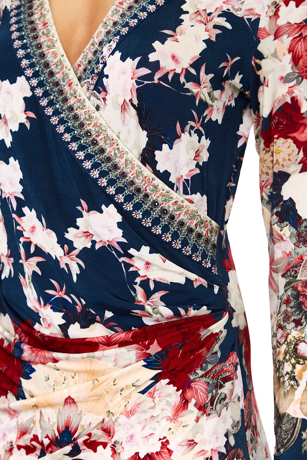 Moving to the gentle rhythm of her soul's awakening, the Twin Shadow Wrap Dress evokes the enchanting floral blooms of mystical Japan with a feminine hand-painted print. A vision of romantic elegance, this wrap-front gown features a softly curving hemline, flattering ruched waist and a scattering of hand placed crystals for a luminous finishing touch.